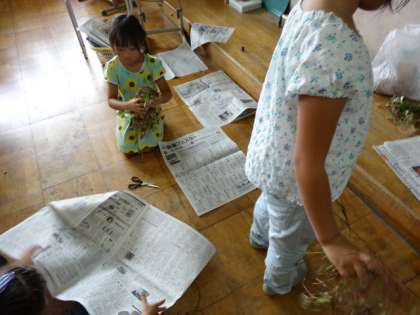 根は,ハサミで切ってから名前を書いた新聞に入れて集めました。