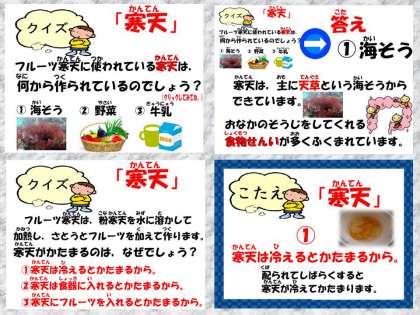 各クラスでは,電子紙芝居「給食室からこんにちは」で,「寒天」に関するクイズを楽しみながら給食をいただきました。