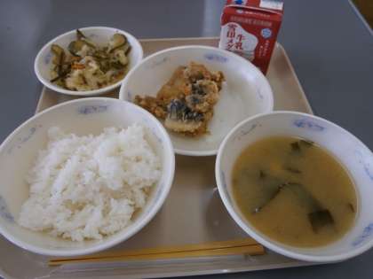 子ども達にとって食べやすい『とびうおのこはくあげ』で登場させました。大人でも食べたことのある人は少なく「以外と あっさりしていてくせがなく こはくあげがよく合いますね。」と言ってもらいました。子ども達からは,「とびうおのこはくあげが かりかりしておいしかったです。」「中がふわっとしていました。」「ちょうどいい形でたべやすかったです。」とたくさんの「おいしい」感想が届きました。