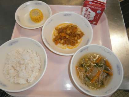 今日の給食は,各自教室でごはんにのせて食べるセルフ『大豆とツナのドライカレー』でした。大豆をびっくり炊きという調理法で熱湯で戻して コトコト1時間近くに煮てやわらかくしてから ツナや野菜と一緒に調味液で煮て仕上げました。