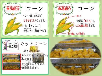 『カットコーン』は,一年に1度登場する献立です。伏見南浜小学校では,スチームコンベクションオーブンで30分間蒸しました。余分な水分が飛んで,とっても甘くなりました。子ども達からも「コーンがあまくて かわがやわらかかったので もくもくとたべられました。」や「カットコーンが甘くてとっても美味しかったです。また出してほしいです。」という感想もたたくさん届いていました。