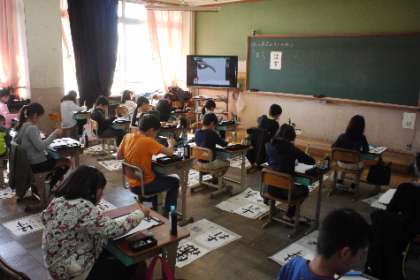 今日は「『結び』の筆使いの違いや字形に気をつけて書くことができるようにする」というめあてで【はす】という文字を書きました。平がなということで簡単に考えていたようですが,穂先の動きが難しかったようです。来週にもう一度書くのでさらにいい作品に仕上げてもらいたいです。