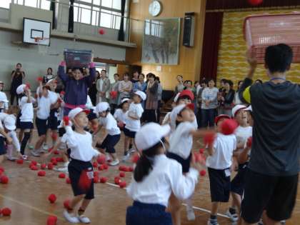 たとえば,1組の子どもたちが競技する時は,2組と3組の担任が買いカゴを持って逃げます。
