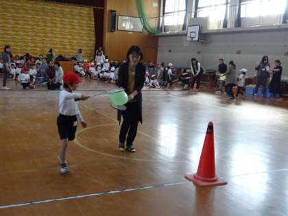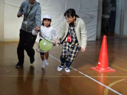 バドミントンのラケットに風船を挟んで進むリレーです。友達のお家の方と一緒に走りました☆