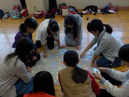 この日は,自分の「色」を練習するグループや,札を部屋一面に撒いて体を使ってとるグループ,あるいは100枚取りに挑戦するグループなど しっかり目的をもって楽しんでいました。