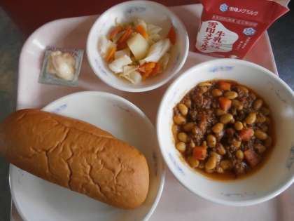 今日の給食は,カレー味の大豆料理『チリコンカーン』でした。