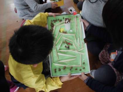 自分たちでまとを作り,景品のコマやネックレスを作りました。