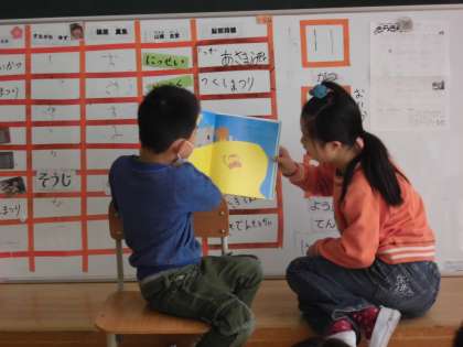 つくし学級では,毎朝,その日の日直2人が読み聞かせの本を選んでいます。