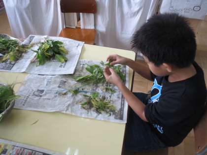 枯れた葉や土を丁寧に取り除く子ども達。