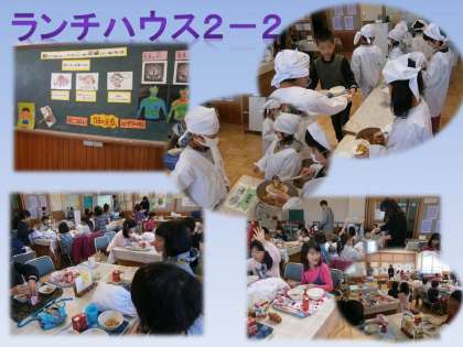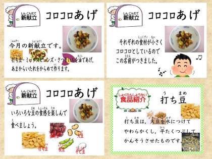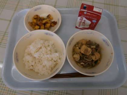 油で揚げた「ミックスビーンズと打ち豆」・今が旬の「さつまいも」を小さくコロコロに切って甘辛いタレでからめました。「大学いものみたいな味がする。」と言っていた2年生。「これは何?」と打ち豆を不思議そうに見て「せんべいみたいにかりかりやなぁ」と味わいの感想を言ってくれました。「打ち豆は大豆から作られているんだよ。」というと「ぜんぜん違う感じや かんでたら味が出てくる」と感想を伝えてくれました。