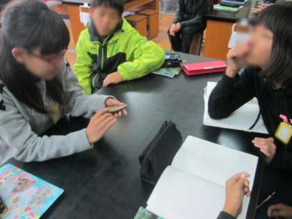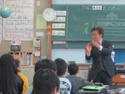 理科の「土地のつくりと変化」の学習では,京都教育大学より講師の方に来て頂きました。地層や化石についてお話を聴きました。