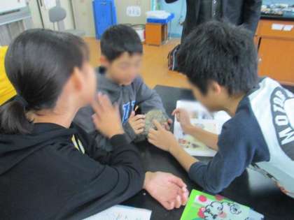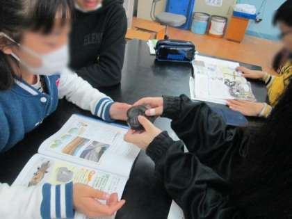 アンモナイトや魚の化石を間近に見て,感想を友達と交流します。