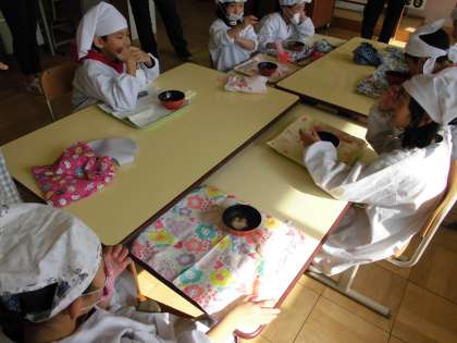ぜんざいが出来上がり,給食のデザートとして食べました。