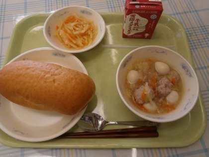 今日の給食は,『肉だんごのスープ煮』でした。肉だんごは,豚ひき肉に,しょうが・たまねぎ・かたくり粉・塩・こしょう・料理酒・しょう油・水を入れ,よくまぜ合わせてから丸め,スープに入れて作りました。はくさい・にんじんの甘味。はるさめののど越しの良い食感。うずら卵の舌触り。なんといっても,肉だんごがふわふわで口の中でほろっとつぶれるなめらかなやわらかさが,大人気の秘密です。