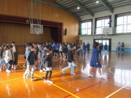 体育館で中学校の生徒会に迎えていただき,子どもたちはドキドキです。