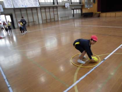 あまり使ったことのない形のボールに,みんな興味津々!