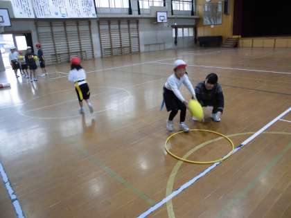 最後は,邪魔をする先生をすり抜けて,床のフラフープの中にボールを置いたら得点!