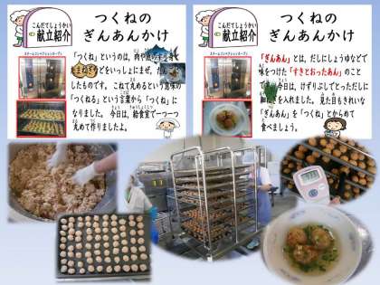 今日の給食は,スチームコンベクションオーブンで「つくね」を焼き,「すきとおったあん」という意味の「ぎんあん」をかけて食べる『つくねのぎんあんかけ』でした。