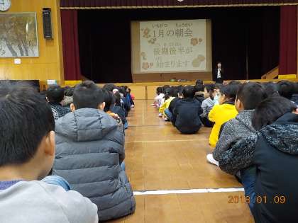 朝会では,校長先生から年初の「あいさつ」や「干支」の話の後,「昔話」を題材に「自分の言動を謙虚にふりかえることの大切さ」を学習しました。