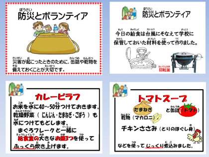 メニューは,台風接近時に備えて備蓄しておいた物資を使って『カレーピラフ』と『トマトスープ』の献立にしました。いざという時の備えの大切さを学ぶ献立です。