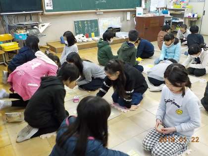 後半は,複数の色札を散らして数人ごとのグループで札を取り合いました。