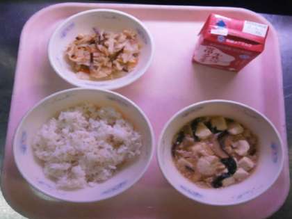 今日の給食は,とうふ料理『とうふのそぼろ煮』でした。大量調理でのとうふ料理のポイントは,少し小さめに切って,豆腐を加えてすぐにかき混ぜず,熱が入ってからかき混ぜると,煮崩れしにくく味も入りやすくなります。最後に水どきのかたくり粉を加えて仕上げることで,とろみが料理を冷めにくくしてくれます。寒い時期にはぴったりの料理です。