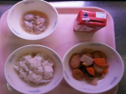 今日の給食は,研究を重ねて昨年度初めて登場した『あげ里いものあんかけ』でした。手作りの美味しさが味わえる献立で,里いもを昆布だしの煮汁で煮て下味をつけてから,米粉をまぶして170度の油で揚げ,鶏ひき肉を炒めてかつお節からとっただし汁で「そぼろあん」をつくって,教室で「あげ里いも」に「そぼろあん」をかけて食べました。 やさしい上品なおいしさと言ったらイメージしてもらいやすいのではないでしょうか。