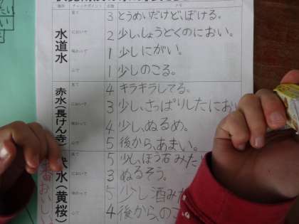 それぞれのおいしさを点数化し,わかりやすく表にまとめてみたり,伏見南浜の水の『良さ』をキーワードにしてみたり,それぞれが工夫をし,体験をもとに感じたことを整理しています。
