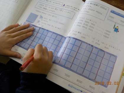 教科書では,100のかたまりをもとに,100が10こで1000。そして,1000のかたまりがいくつあるか調べていきます。