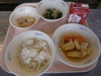 今日の給食は,給食室で調理するとかみなりがなってるみたいな音がする『かみなりこんにゃく』でした。こんにゃくをごま油で炒める時に「バリバリバリバリ」音がします。よく炒まってくるとかみなりは消えちゃいます。けずりぶしでとっただし汁と砂糖・みりん・しょうゆで味付けして,最後に花かつおを加えて『かみなりこんにゃく』の出来上がりです。