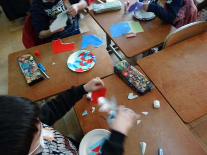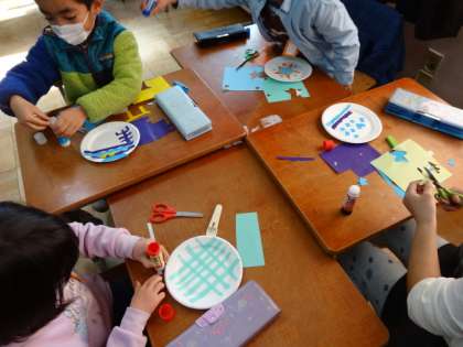 切ったり,貼ったり,塗ったりして思い思いのお皿を作っています☆