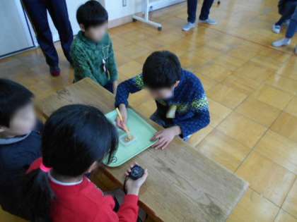 正座をして,箸使いに気をつけながら,27個の豆を小さな器に移しました。