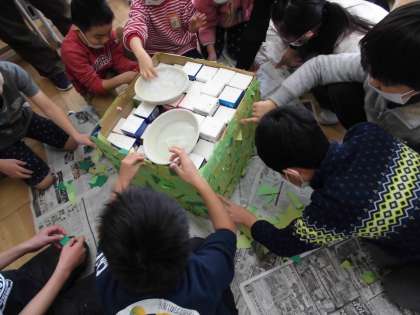 小さな巨匠展に向けて,下鳥羽小,伏見住吉小,伏見板橋小の友達が,共同作品を作りにつくし学級に集合してくれました。