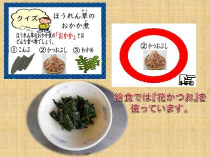 副菜の『ほうれん草のおかか煮』もしっとりとしていて食べやすかったです。「おかか」って何かなというクイズを給食室からこんいちはで楽しみました。