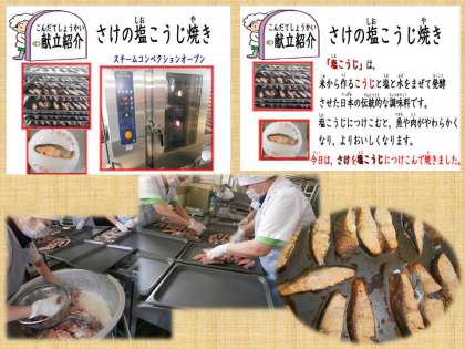 今日の給食は,スチコンを使った焼き魚『さけの塩こうじ焼き』でした。