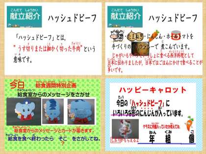 「ハッシュドビーフがとてもおいしかったです。ありがとうございました。」「ハッシュドビーフがおいしかったです。ごはんにかけたらほしがたのにんじんがでてきたのがびっくりしました。」…1年生