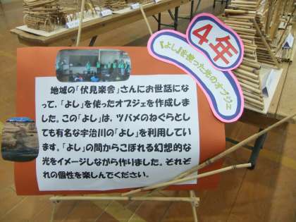 本日から22日まで,体育館で造形展を開催しています。たくさんの保護者の皆様と共に,今日は素敵なお客様が来てくださいました。4年生の「光のオブジェ」を指導してくださった『伏見楽舎』のみな様や伏見区長様,副区長様,まちづくり推進課長様です。子どもたちの思いのつまった作品を見て,一つ一つのよいところをたくさんほめてくださいました。「みんな頑張ったね。作品にすてきなところがいっぱいあらわれているよ!」と,とても嬉しい気持ちになりました。見に来てくださって本当にありがとうございました。