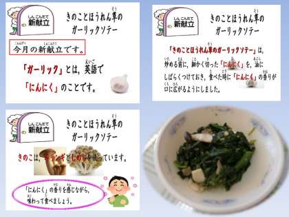 今日の給食は,新しい献立『きのことほうれん草のガーリックソテー』でした。