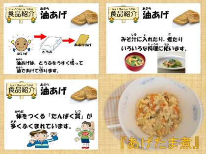 今日の給食は,大豆製品「油あげ」を使った卵料理『あげたま煮』でした。