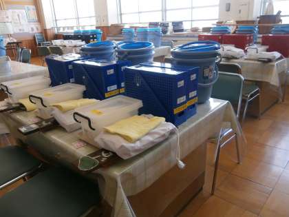 ランチハウスには,給食で使う用具が準備中。