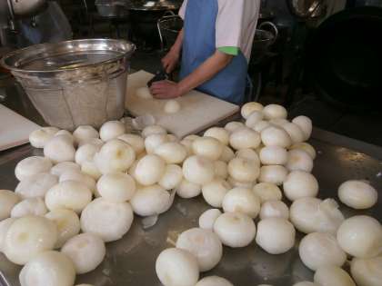 給食室では,『スパゲティーのミートソース煮』に使う36キロの「たまねぎ」をみじん切りにして準備中。