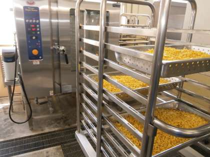 早速 自慢のスチームコンベクションオーブンを使ってコーンを蒸す準備中。