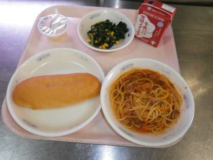 例年子どもたちに食べやすい 『小型のコッペパン』と『スパゲティのミートソース煮』です。副菜には「コーン」の入った『ほうれん草のソテー』 入学・進級をお祝いするデザートは,『りんごゼリー』の組み合わせでした。