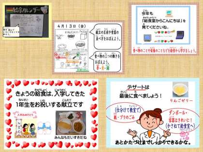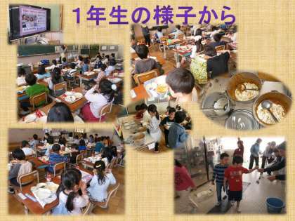 初日ということもあり,給食調理員さんの学級訪問では,校内の電子機器による「給食室からこんにちは」に写る4人の給食調理員さんが実際に教室に来てくれて,チョッピリおどろき。 「おいしいですか?」の問いかけに にっこり笑って「おいしい。」と心通う一時でした。