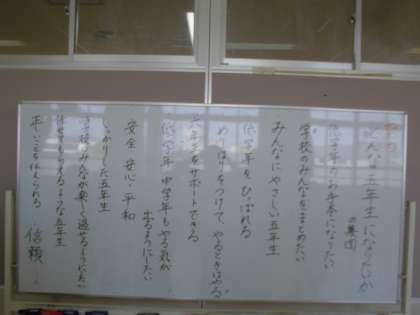 はじめに,5年生で頑張りたいことを子ども達に質問しました。「頼れる5年生になりたい」,「低学年のお手本となる姿になりたい」など,高学年としての自覚を感じる発言が多くありました。