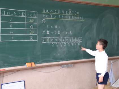 「5×0は,5×1よりも5小さいので0ということが分かりますね。」と言うこととを黒板でたくさんの人が説明できました。