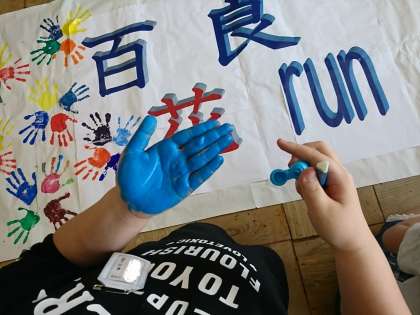 学年目標の「百花良run」にグループで手形をおして花を咲かせました。思い思いの色で自分らしさを表現していました。次は,どんな花が咲いていくのか楽しみです。