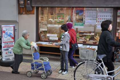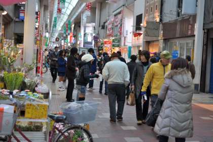 リボンをつけて,きれいなしおりにしたものを,大手筋商店街で配りました。