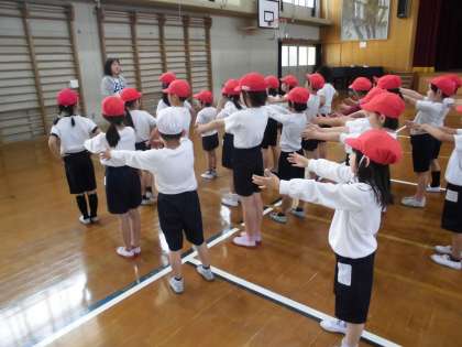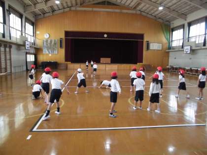 2年生の体育では,自分の並ぶ場所や間隔がわかって整列したり,みんなとルールを守って楽しく「だるまさんがころんだ」をしたりしました。