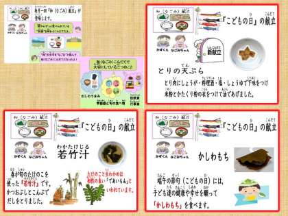 今日は,京都市で平成27年から実施している和食推進の日『和(なごみ)献立』でした。月に一度,和食の良さを味わう日です。和食で大事にしている三つの事を季節に合わせた献立を通して紹介していきます。今回は,子どもの日の行事にちなんだ献立にしました。